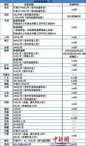 日前,天津公布了今年高温津贴的标准,较去年又有所提升。 按照天津市的地方标准,高温津贴日标准为上年度全市职工日平均工资的12%,防暑降温费月标准为上年度全市职工月平均工资的3%。按照2018年度天津职工月平均工资5871元计算,今年天津的高温津贴标准上调至32元,防暑降温费为每月176.1元。 除天津外,今年5月,上海人社部门宣布,夏季高温津贴标准从200元/月调整为300元/月,执行时间为每年6月1日至9月30日,共四个月。 早前福建也明确,从今年5月1日起,对夏季高温津贴发放标准进行调整。 调整后,福建省行政区域内的企业、个体经济组织以及民办非企业单位等组织,5月份应当按实际高温天数向劳动者支付高温津贴;6-9月份应当按月或按实际高温天数向劳动者支付高温津贴。这其中,按月计发的,每人每月260元;按天计发的,每人每天12元。